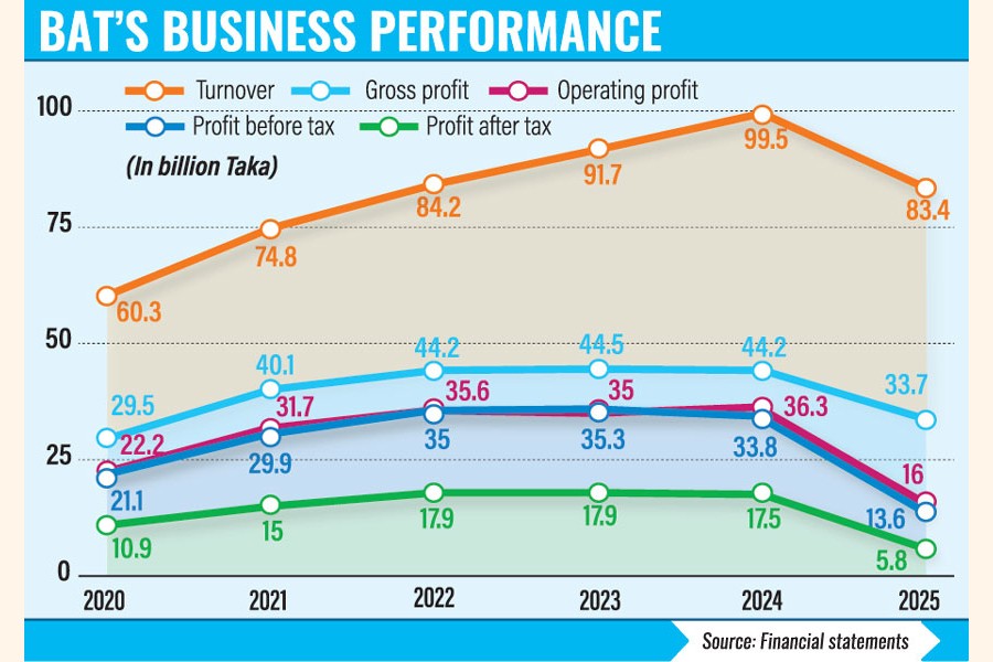 British American Tobacco Bangladesh Company (BATBC) posted a steep 67 per cent year-on-year decline in profit after tax in 2025, hit by a mid-year excise duty hike and a forced factory relocation that drove up one-off costs.