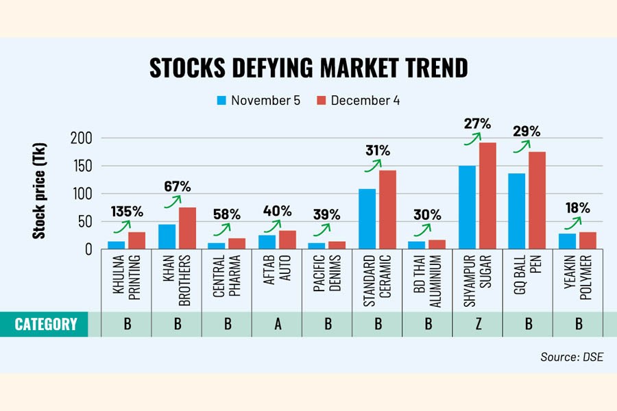 The stock price of Khulna Printing & Packaging, for example, more than doubled in the month to Monday though it had incurred losses for the past five consecutive years. Losses piled up to Tk 960 million until FY22.