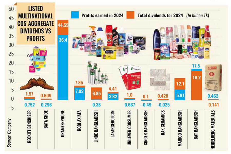 Grameenphone, Bata Shoe, Reckitt Benckiser, Robi Axiata, Linde Bangladesh, LafargeHolcim, Marico Bangladesh and Unilever Consumer Care declared record dividends for 2024, more than their annual profits.