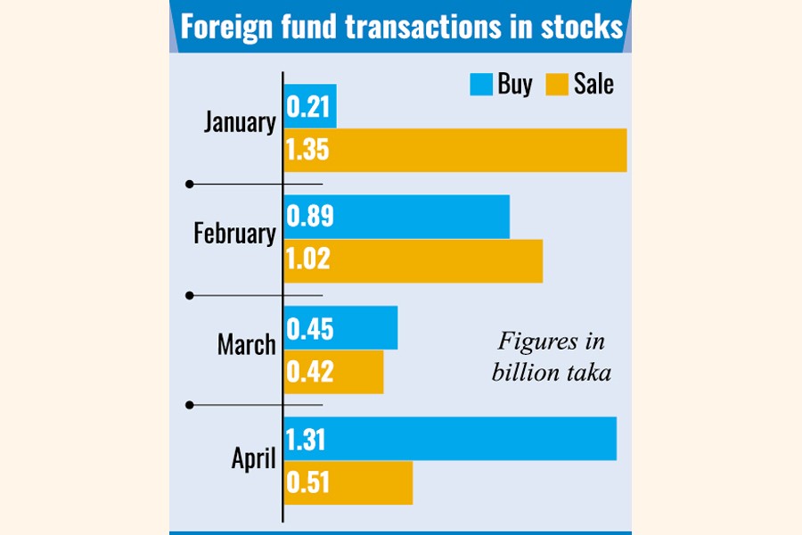 In April, share purchase by foreign investors amounted to Tk 1.31 billion while sales were worth Tk 507 million, in contrast to what was seen three months back.