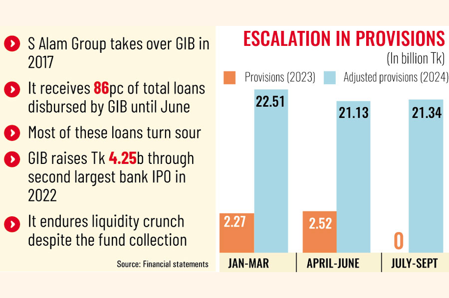 S Alam Group and its associated companies reportedly borrowed more than 86 per cent of the loans disbursed by GIB. The bank disbursed loans amounting to Tk 138.80 billion as of June this year.