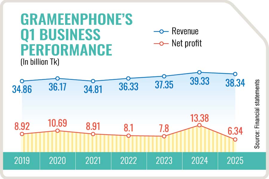 Grameenphone's net profit for the first quarter of 2025 plunged 53 per cent year on year to Tk 6.34 billion, owing to sharp declines in data pricing amid lingering macroeconomic pressures.