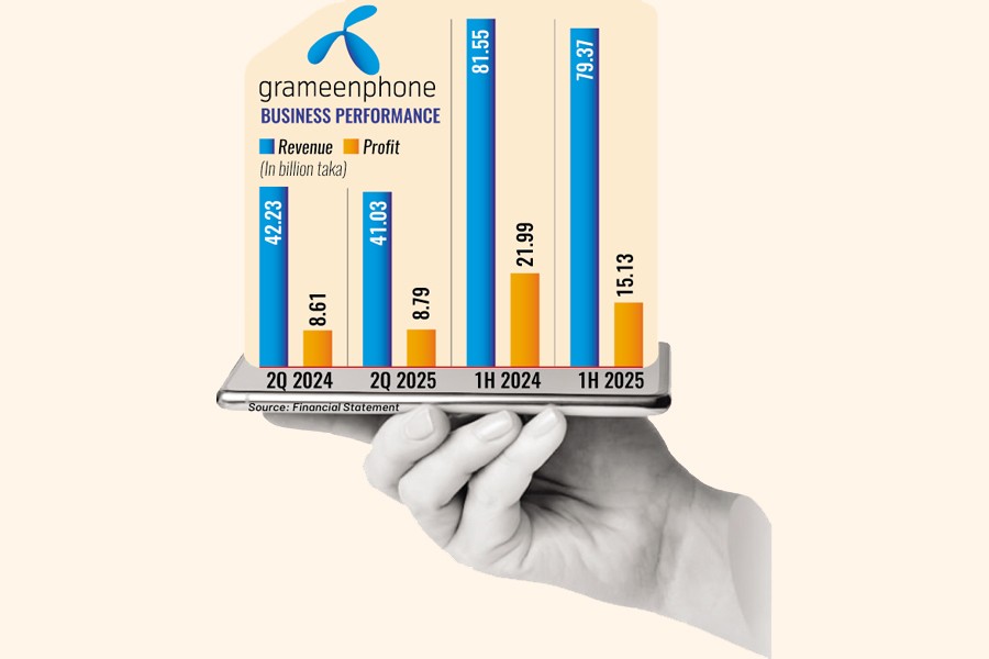 Grameenphone's net profit was down 31 per cent year-on-year to Tk 15.13 billion in H1, 2025 following a plunge in operating profit during the period compared to the same period a year ago.