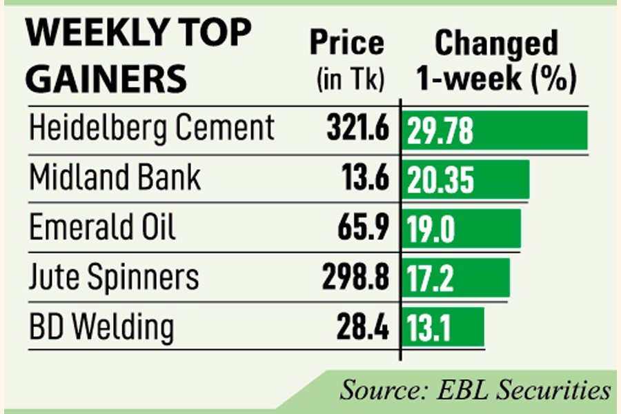 Shares of Heidelberg Cement Bangladesh jumped nearly 30 per cent in the outgoing week to Wednesday, making it to the top of the weekly gainers' list, as the company returned to profit in the first quarter of 2023.