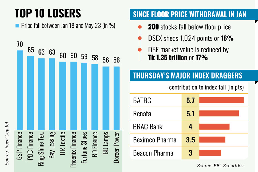 The DSEX lost 384 points in the past eight trading days. The index lost more than 1,024 points or 16 per cent since the removal of floor price in January this year. At the same time, the market value shed Tk 1.35 trillion.