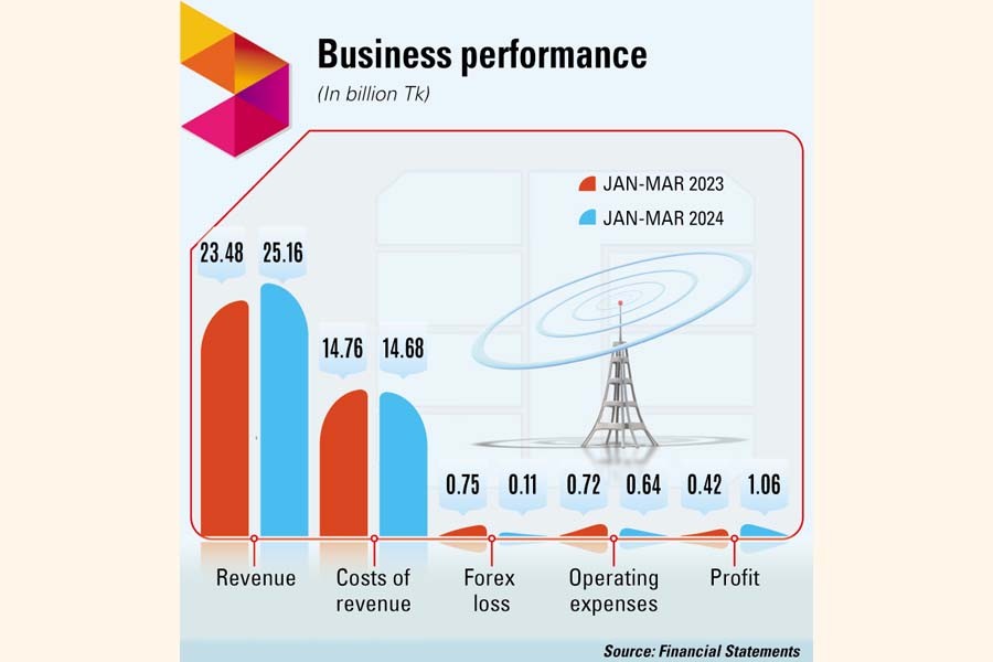 Robi Axiata posted an impressive 154 per cent year-on-year growth in profit to Tk 1.06 billion for January-March of FY24, supported by a robust revenue growth and a significant decrease in forex loss.