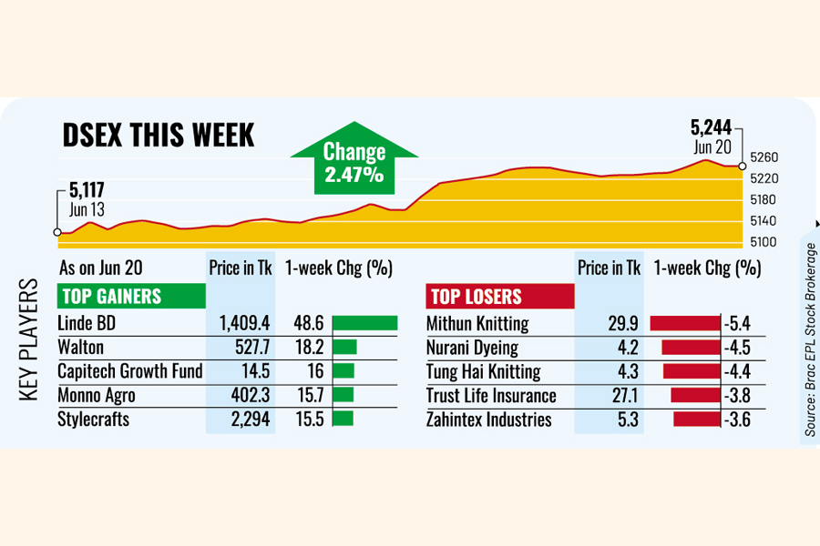 Dhaka Stock Exchange (DSEX) soared more than 126 points or 2.47 per cent to settle at 5,244 on Thursday, paring all the losses from the previous week. The DSEX lost a total of 548 points in the previous five weeks.
