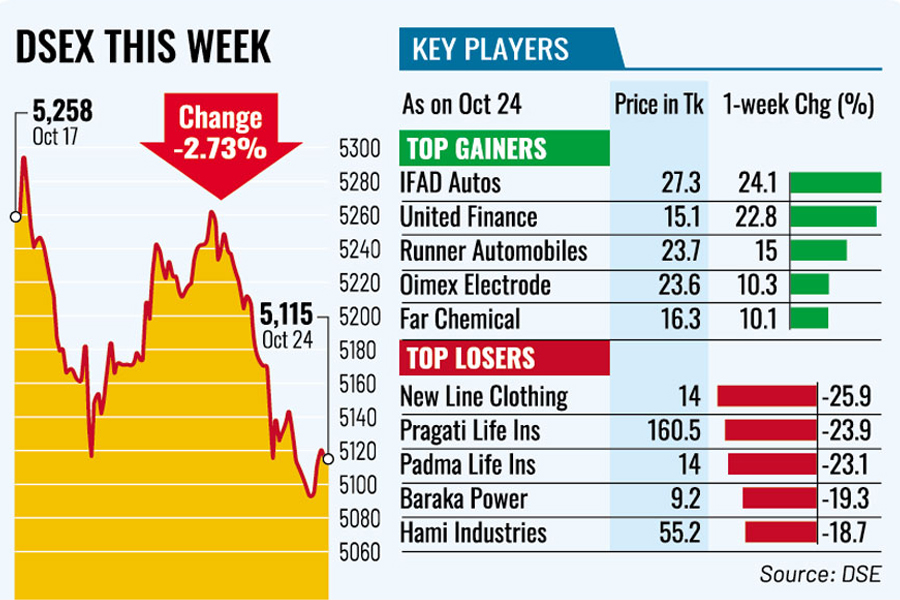 The DSEX finally ended the week at 5,115, losing more than 143 points or 2.73 per cent. This is the lowest level of index since June 12 when the DSEX hit 5,083. The index lost an aggregate 616 points in the past five straight weeks.