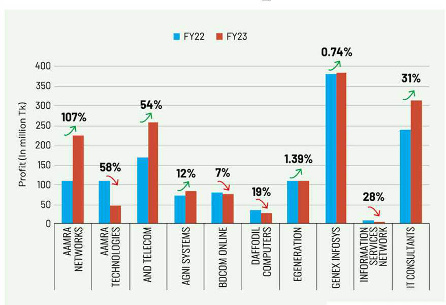 Among the profit-making entities, Aamra Networks has reported the highest year-on-year profit growth of 107 per cent for FY23, followed by eGeneration, ADN Telecom, IT Consultants, Agni Systems, and Genex Infosys.