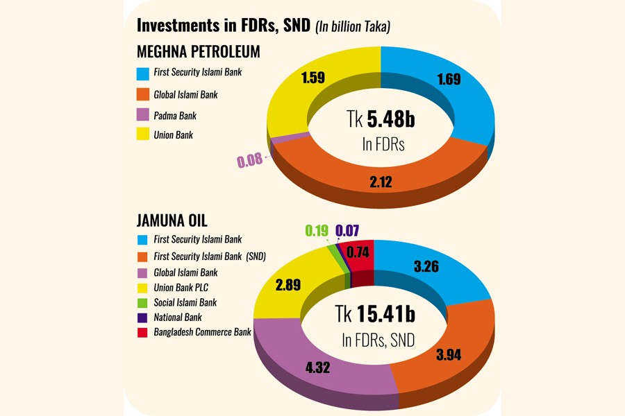 Jamuna oil holds FDRs amounting to Tk 11.47 billion in First Security Islami Bank, Global Islami Bank, Union Bank, Social Islami Bank, National Bank, and Bangladesh Commerce Bank. It also has another Tk 3.94 billion placed in SND (Special Notice Deposit) account in First Security Islami Bank.