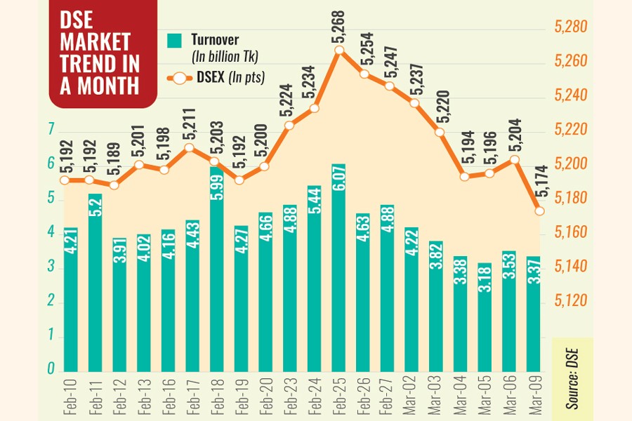 The DSEX, key index of the Dhaka Stock Exchange (DSE), finally went down nearly 30 points or 0.56 per cent to settle at 5,174, lowest since February 10.