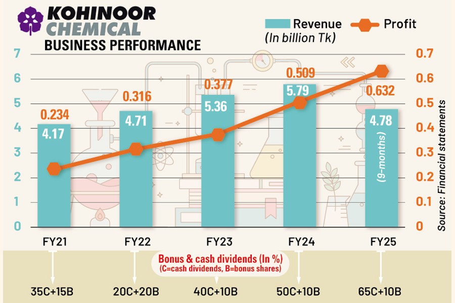Kohinoor Chemical posted a record profit of Tk 632 million in FY25, driven by higher sales and a reduction in raw material prices.
