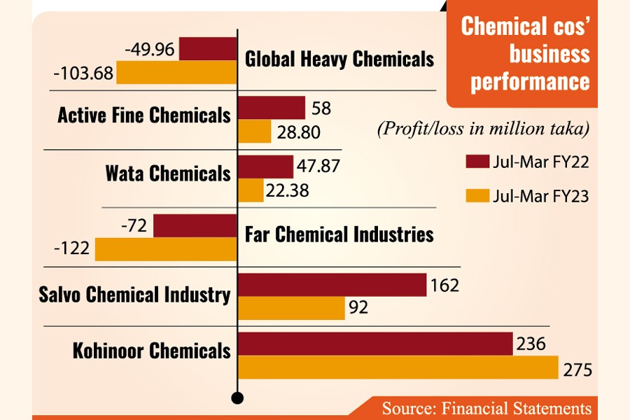 As a result, profit of Active Fine Chemicals, Salvo Chemicals, and Wata Chemicals dropped sharply, while losses of Far Chemical and Global Heavy Chemicals more than doubled year-on-year in the three months through March this year.
