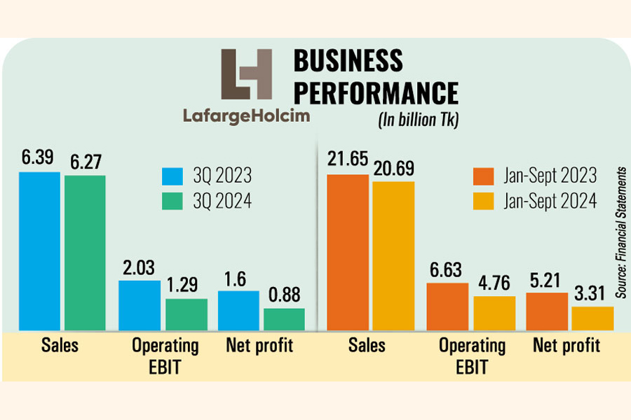 LafargeHolcim's nine-month's sales slid 4 per cent year-on-year to Tk 20.69 billion in January-September this year while profit plunged 37 per cent to Tk 5.21 billion during the time.