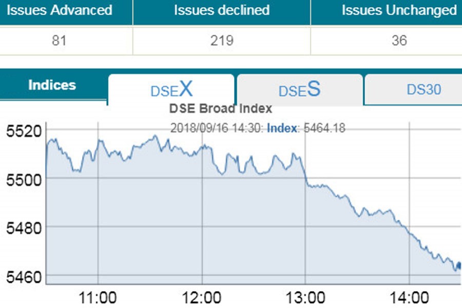 At the end of the session, DSEX, the prime index of the Dhaka Stock Exchange (DSE), went down by 36.44 points or 0.66 per cent to settle at 5,464.