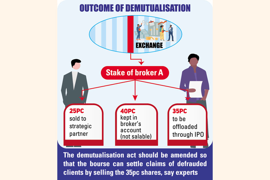 Managing Director of Midway Securities Md. Ashequr Rahman said the demutualisation act should be amended enabling the exchanges to utilize funds from the sale of brokers' 35 per cent stakes in settling claims.