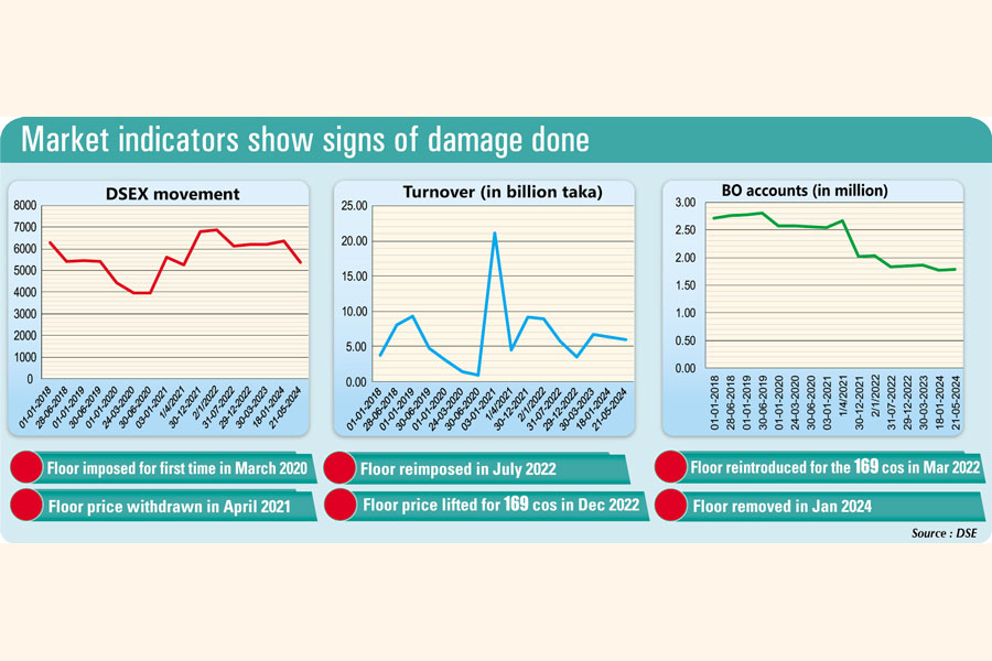 Then it lost more than 15 per cent or 965 points, tumbling to a more-than-three-year low of 5,371 on Tuesday, since the removal of floor prices. So, the market has already plunged far below from the level where it was in July 2022 when the BSEC reintroduced the floor price.