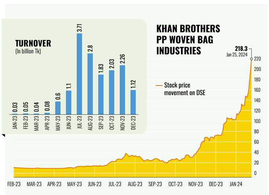 Khan Brothers PP Woven Bag Industries surged an astonishing 975 per cent on the Dhaka Stock Exchange (DSE) since September 18 last year, with its monthly trading volume indicating investors' persistent interest in the stock.