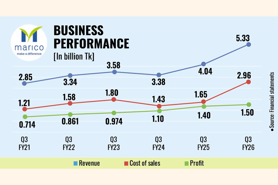 Marico's nine-month profit also rose 8.50 per cent to Tk 4.98 billion in April-December 2025, while revenue jumped 24 per cent to Tk 15.45 billion during the period. The nine months' revenue is almost as much as last year's annual revenue-Tk 16.31 billion.