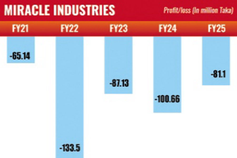 Miracle Industries, a plastic packaging manufacturer, posted a deeper loss in the second quarter (October-December) of FY26, amounting to Tk 21.48 million, compared with a loss of Tk 6.34 million in the same period of the previous year.