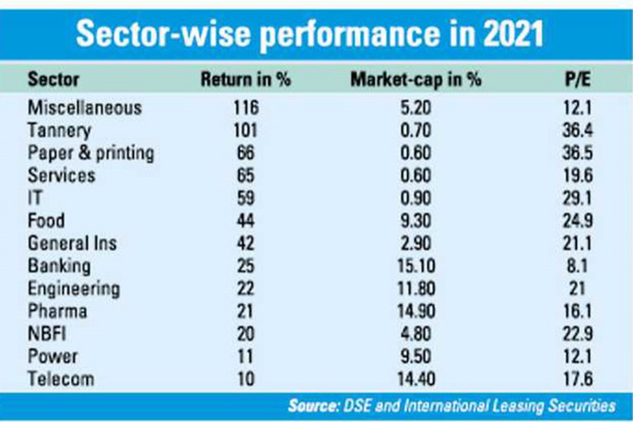 Miscellaneous sector was the best performer on the Dhaka Stock Exchange (DSE) in 2021, showing 116 per cent return while the jute sector was the worst loser, shedding 28 per cent.