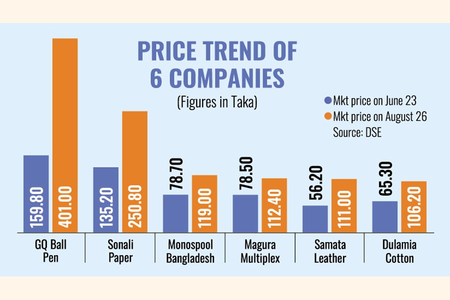 The companies -- GQ Ball Pen, Sonali Paper & Board Mills, Dulamia Cotton Spinning Mills, Monospool Bangladesh, Magura Multiplex, and Samata Leather Complex -- began their upward trajectory on June 23, and the trend continued through August 24, according to DSE data.