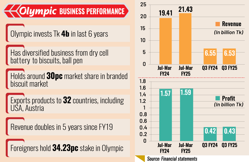 Olympic Industries is the largest biscuit manufacturer in Bangladesh, capturing more than 30 per cent market share, and holds the second position in the battery market in Bangladesh.