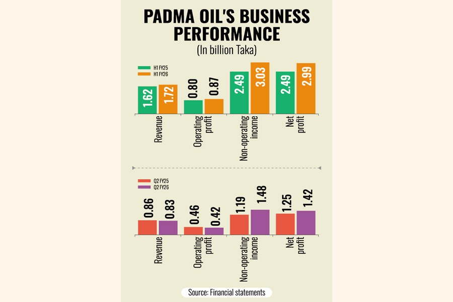 The state-run Padma Oil experienced 13.6 per cent year-on-year growth in profit to Tk 1.42 billion in October-December (Q2) FY26, mainly supported by non-operating income derived from FDRs (fixed deposit receipts).