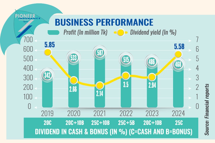 Pioneer Insurance Company Limited reported a profit of Tk 468 million for 2024, the lowest in five years, due to an increase in expenses and a fall in net premium income amid persistent macroeconomic challenges.