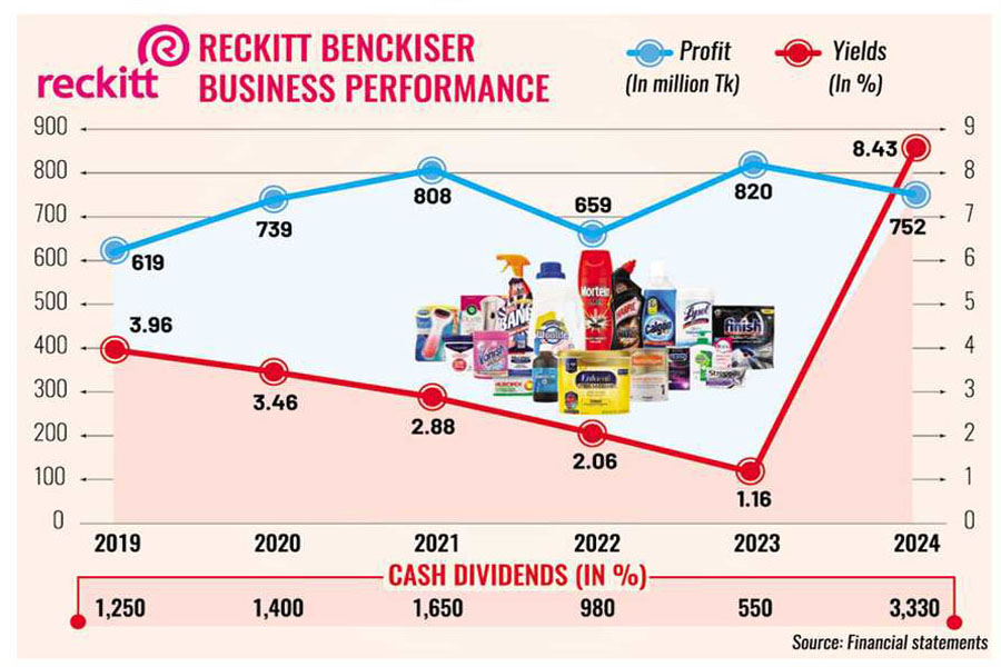 Presently, the number of Reckitt's outstanding shares is 4.72 million. It will pay Tk 1.57 billion in cash dividends to its shareholders against a profit of Tk 720 million in 2024.