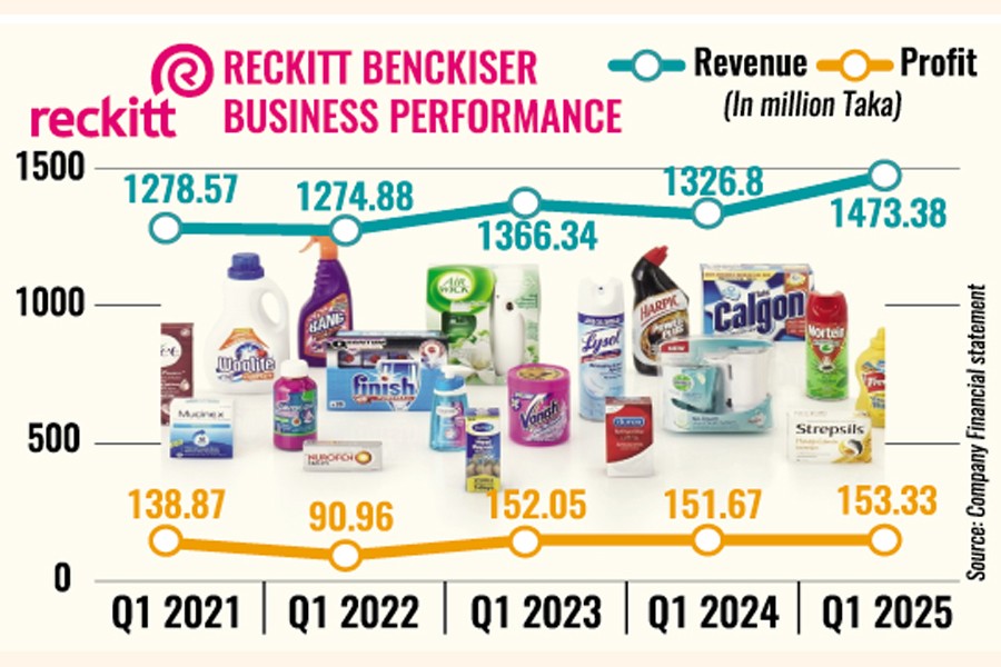 Reckitt Benckiser (Bangladesh) posted a marginal 1.1 percent year-on-year increase in profit to Tk 153.35 million for the first quarter of 2025, supported by an 11.05 percent year-on-year growth in revenue.