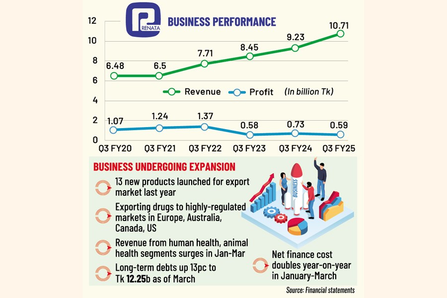 Renata showed a 20 per cent decline in profit to Tk 587.62 million for the third quarter to March of FY25 despite a significant revenue increase, owing to costlier raw materials, higher energy price and finance costs.