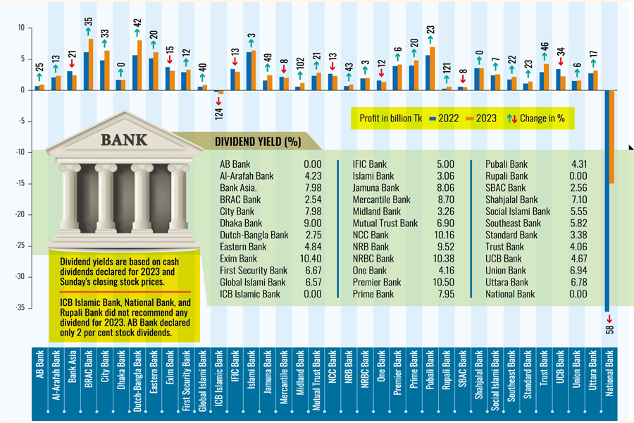 However, ICB Islami Bank and National Bank remained in the red in 2023. Dhaka Bank and Shahjalal Islami Bank failed to elevate their earnings from the previous year, even with high lending rates.