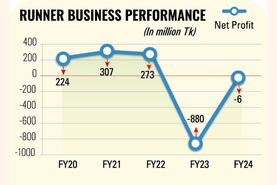 Runner made a loss of Tk 61 million in the year through June this year, down from a loss of Tk 880 million a year ago.