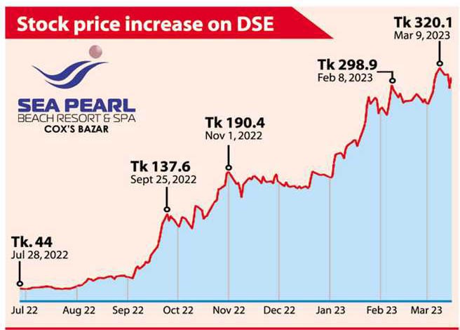 The stock of the five-star hotel in Cox's Bazar started climbing on July 28, 2022. In more than seven and a half months to Thursday, the price per share was multiplied by seven times to Tk 308.20.