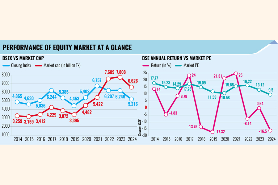 The year 2024 was tough for stock investors, with the benchmark index of the Dhaka Stock Exchange (DSE) losing 16.5 per cent, the biggest annual fall in four years.