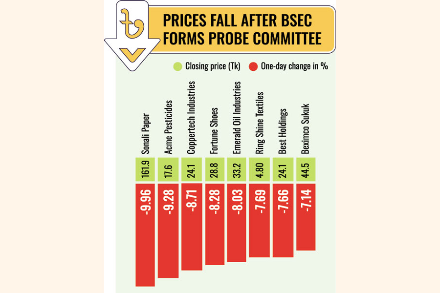 Stock price of Best Holdings also fell 7.66 per cent to Tk 24.1 on Monday as the inquiry committee will investigate the IPO approval procedure of Best Holdings, which raised Tk 3.50 billion from the stock market under the book-building method last year.