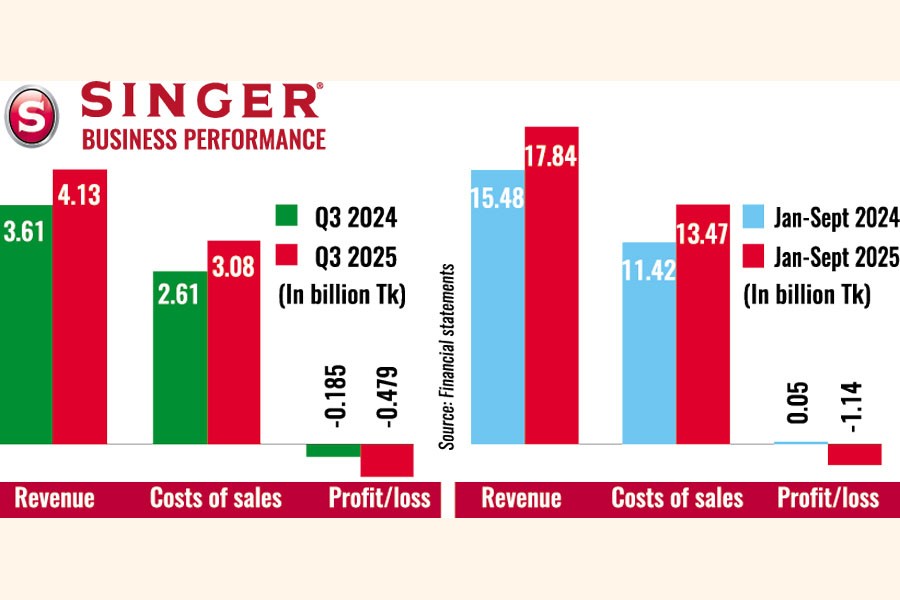Singer endured a loss of Tk 1.14 billion in the nine months through September this year although sales grew 15 per cent year-on-year during the period.
