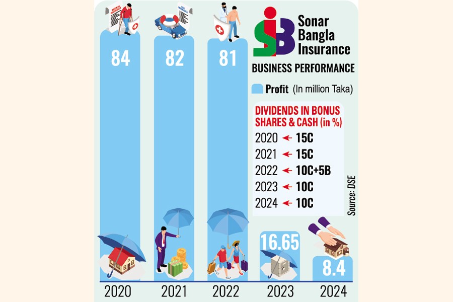 Sonar Bangla Insurance has reported a profit of Tk 8.4 million for 2024, the lowest since its listing in the stock market, thanks to a sharp fall in premium income after the political changeover in August last year.