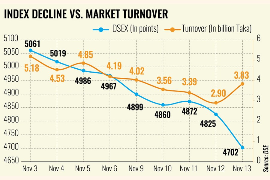 The following day, the DSEX dropped below the 5,000-point mark and continued its declining trend till Thursday, losing a total of 359 points or 7.15 per cent during the period.