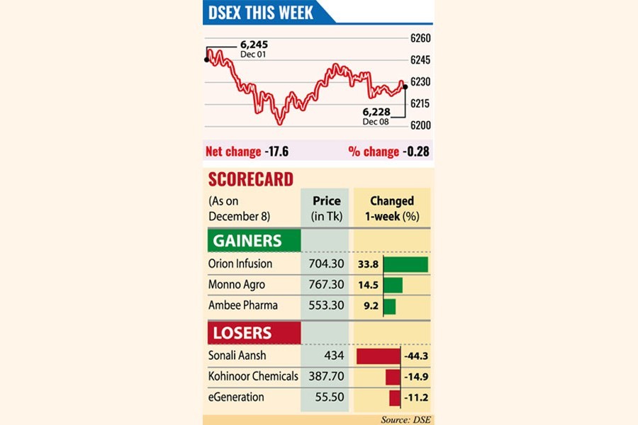 DSEX, the benchmark index of the Dhaka Stock Exchange (DSE), went down by 17.55 points, or 0.28 per cent, to settle the week at 6,227.82 after gaining 30 plus points in the week before.