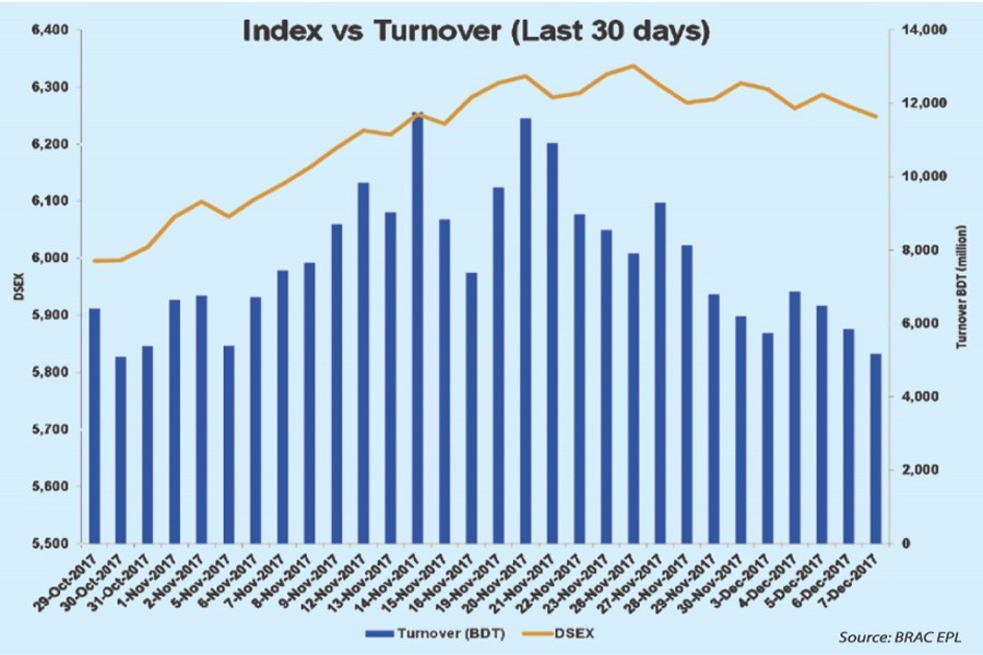 The daily turnover averaged Tk 6.02 billion, which was more than 21 per cent lower than the previous week's average of Tk 7.66 billion.