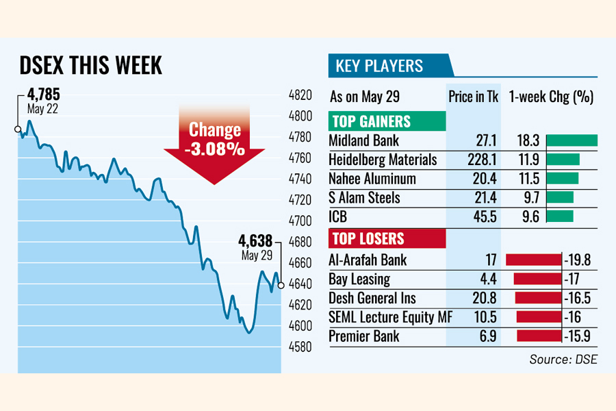 The benchmark DSEX index of the Dhaka Stock Exchange (DSE) finally settled the week 147 points or 3.08 per cent lower at 4,638, after inching up only 4 points in the week before.
