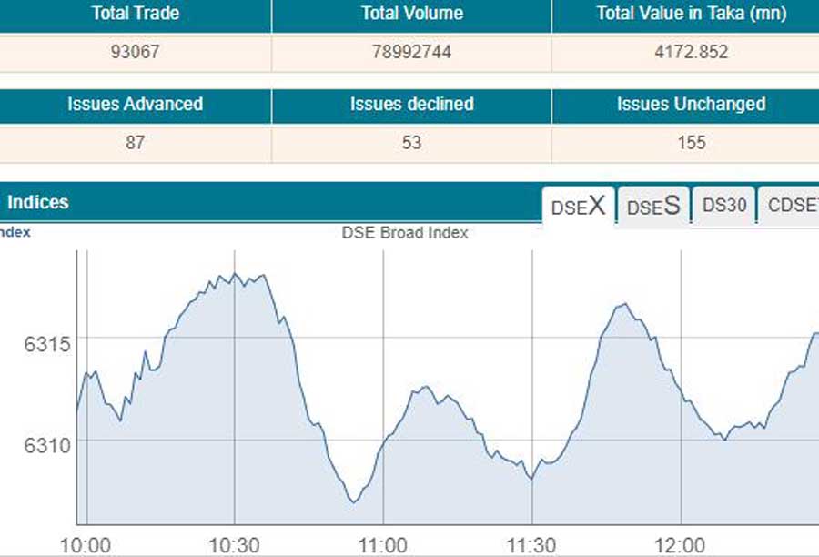 Following the previous day’s positive trend, DSEX, the prime index of the Dhaka Stock Exchange (DSE), went down by 1.30 points to 6,309 after two hours of trading at 12:00 noon.