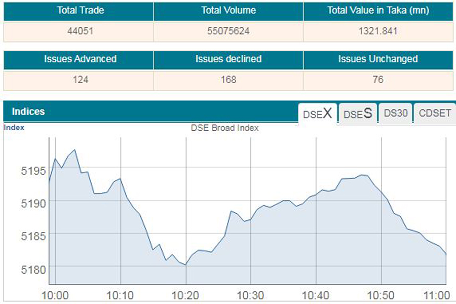 Following the previous week's modest fall, the prime index of the Dhaka Stock Exchange (DSE), went down by 18 points or 0.34 per cent to 5,174 at 11:00 am, when the report was filed.