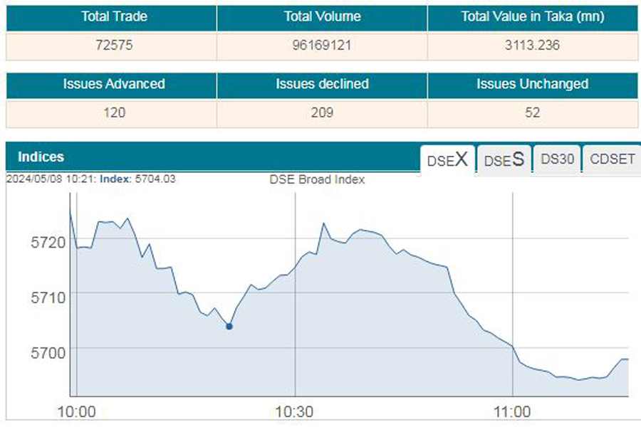 As a result, DSEX, the Dhaka Stock Exchange (DSE) went down by more than 17 points or 0.30 per cent to 5,708, after the first hour of trading at 11:00 am, when the report was filed.