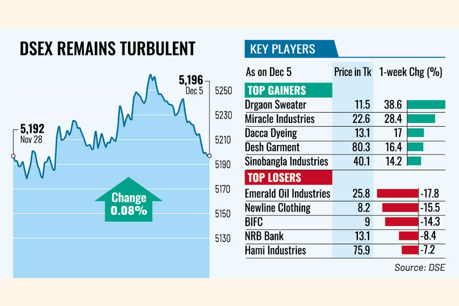 The benchmark DSEX index of the Dhaka Stock Exchange (DSE) settled the week more than 4 points or 0.08 per cent higher at 5,196, after losing 163 points in the past two consecutive weeks.