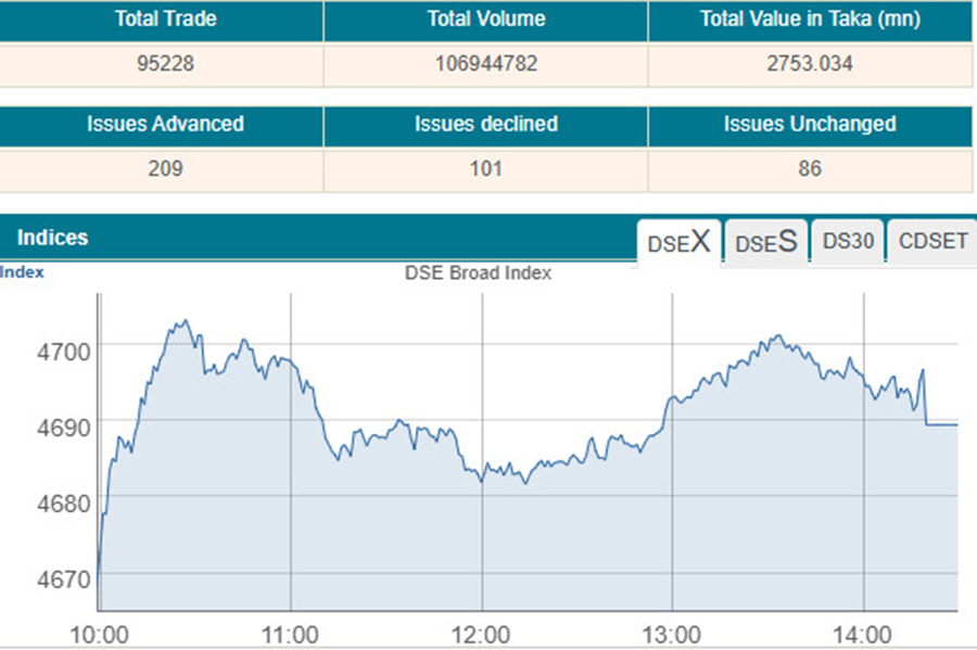 The DSEX, the benchmark index of the DSE, rose by 21.12 points to settle at 4,689.52.