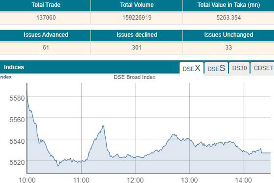 The DSEX, the prime index of the Dhaka Stock Exchange (DSE), went down 58 points to settle at 5,527.