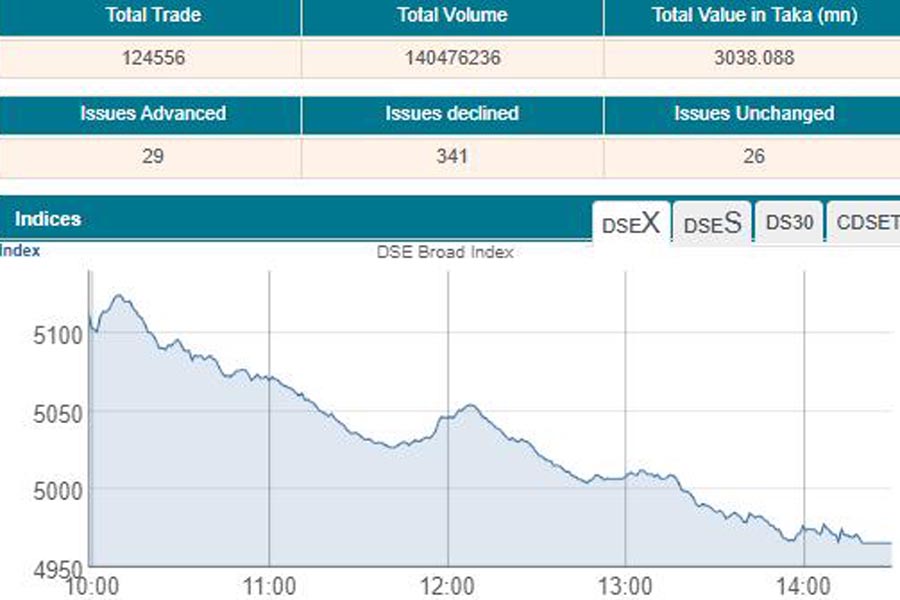 Out of 396 issues traded, 341 declined, 29 advanced and 26 remained unchanged on the DSE trading floor.